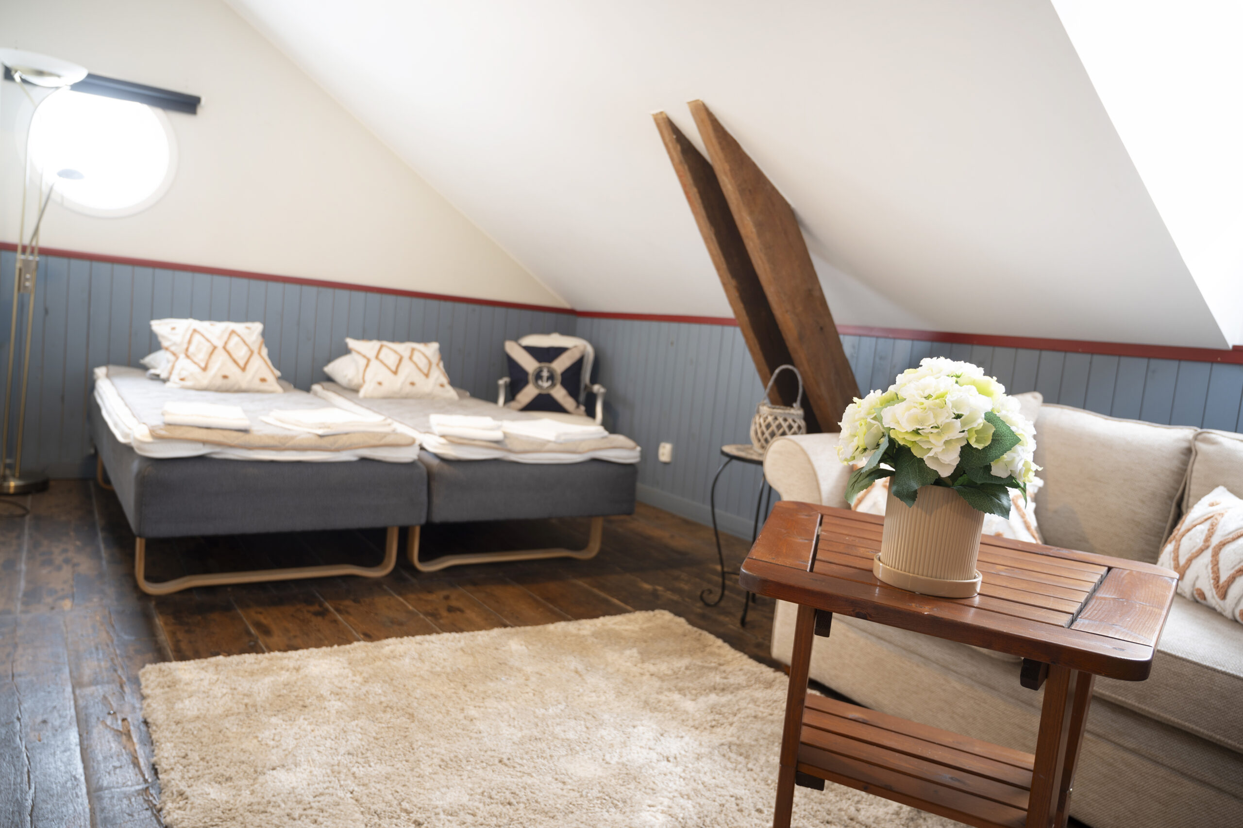 Vårt boende är beläget på magasinets andra våning, där varje rum har sin unika karaktär, från den mysiga Kaptenshytten till den rymliga Matros-hytten.